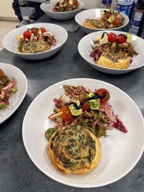 - Vorspeise: Salat mit einer Spinat-, Schinken- und Käse-Teigschnecke